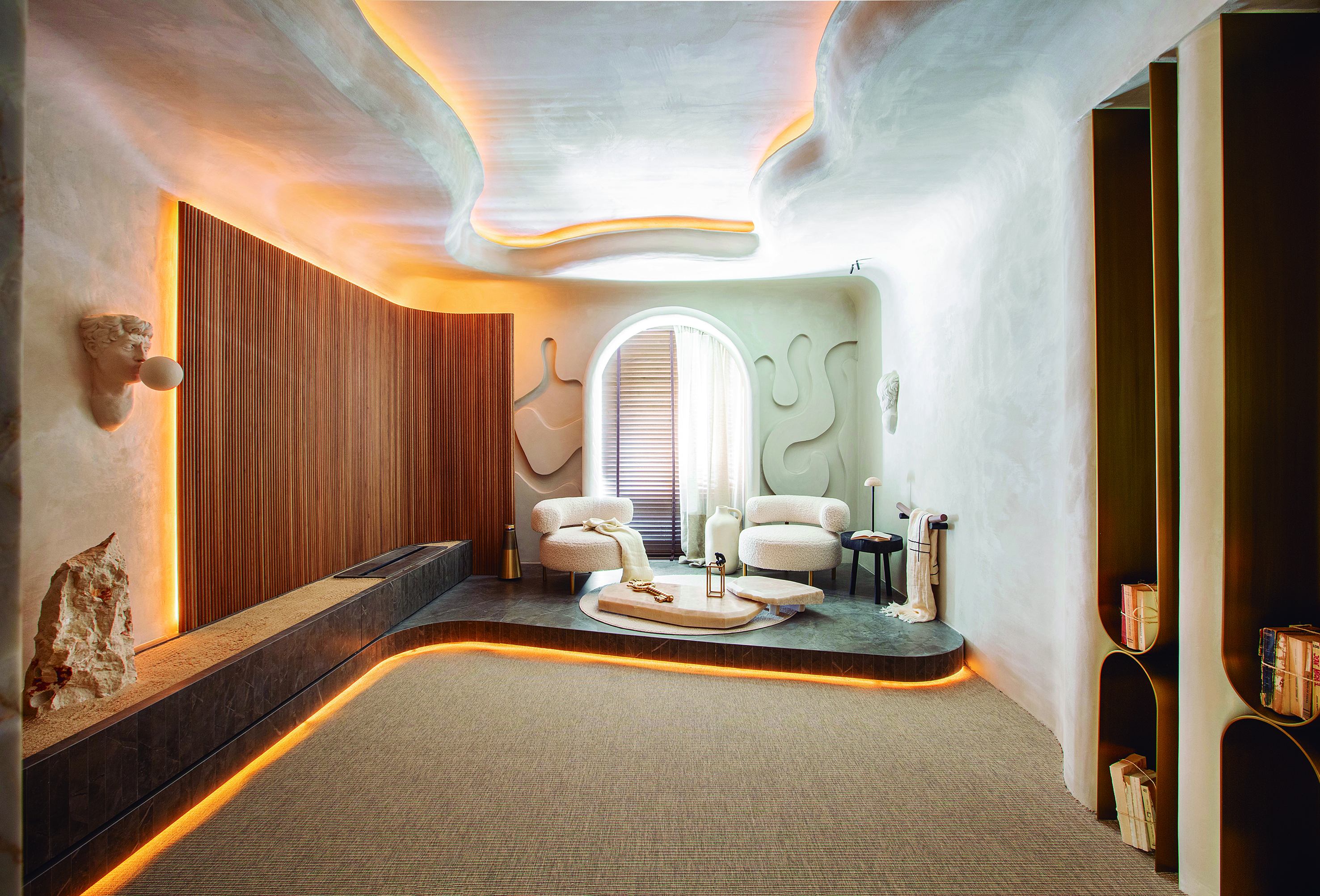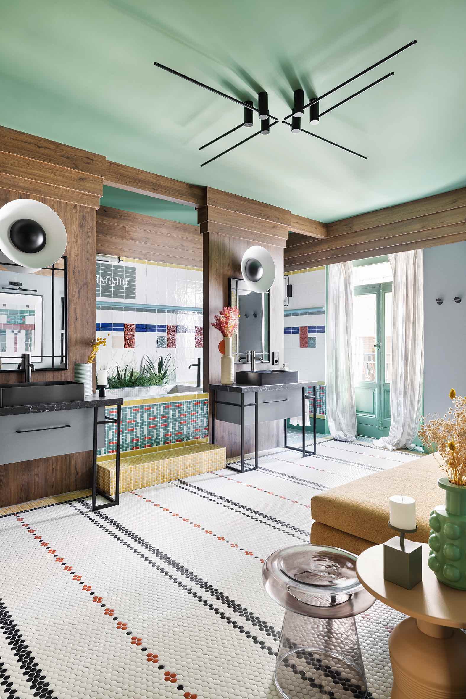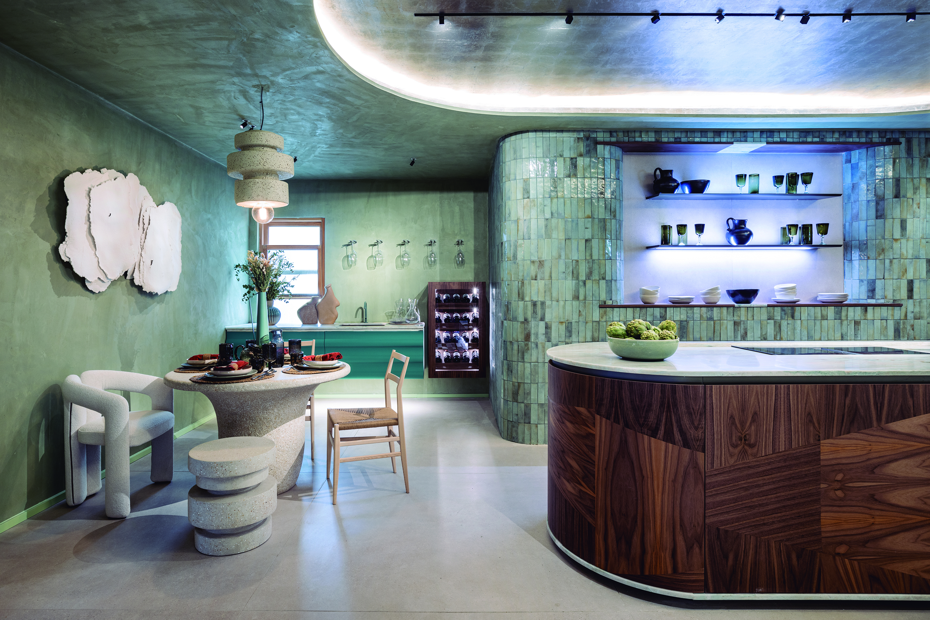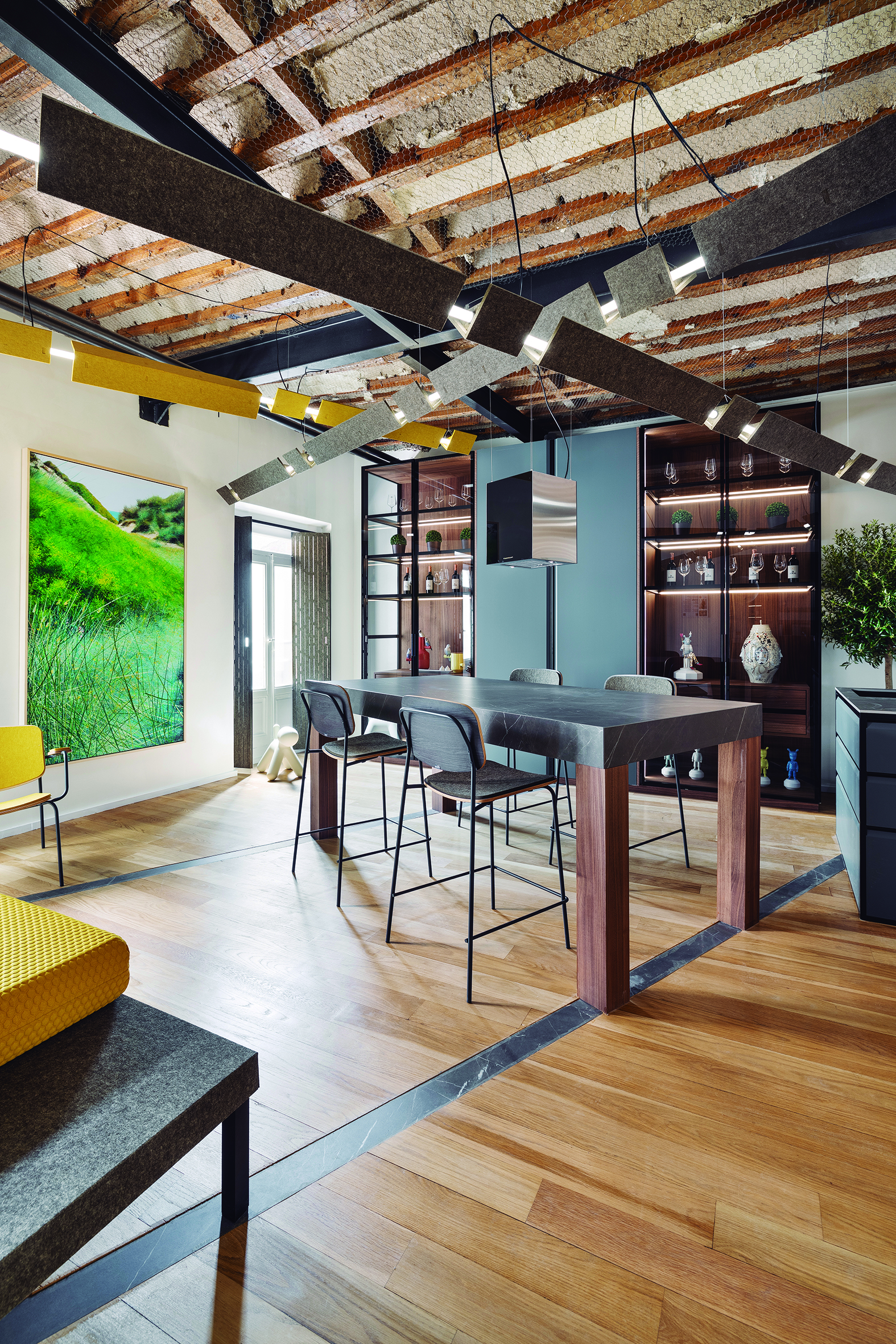 El auge del revestimiento mural: Paredes y techos son lienzos en blanco que se aprovechan al máximo para plasmar en ellos el concepto creativo del espacio. Se recubren de piedra, cerámica, paneles de madera lisa o palillería, escayolas y molduras, murales artísticos, papeles pintados y telas, arcilla, microcemento o pintura con texturas rugosas y volumen pronunciado.