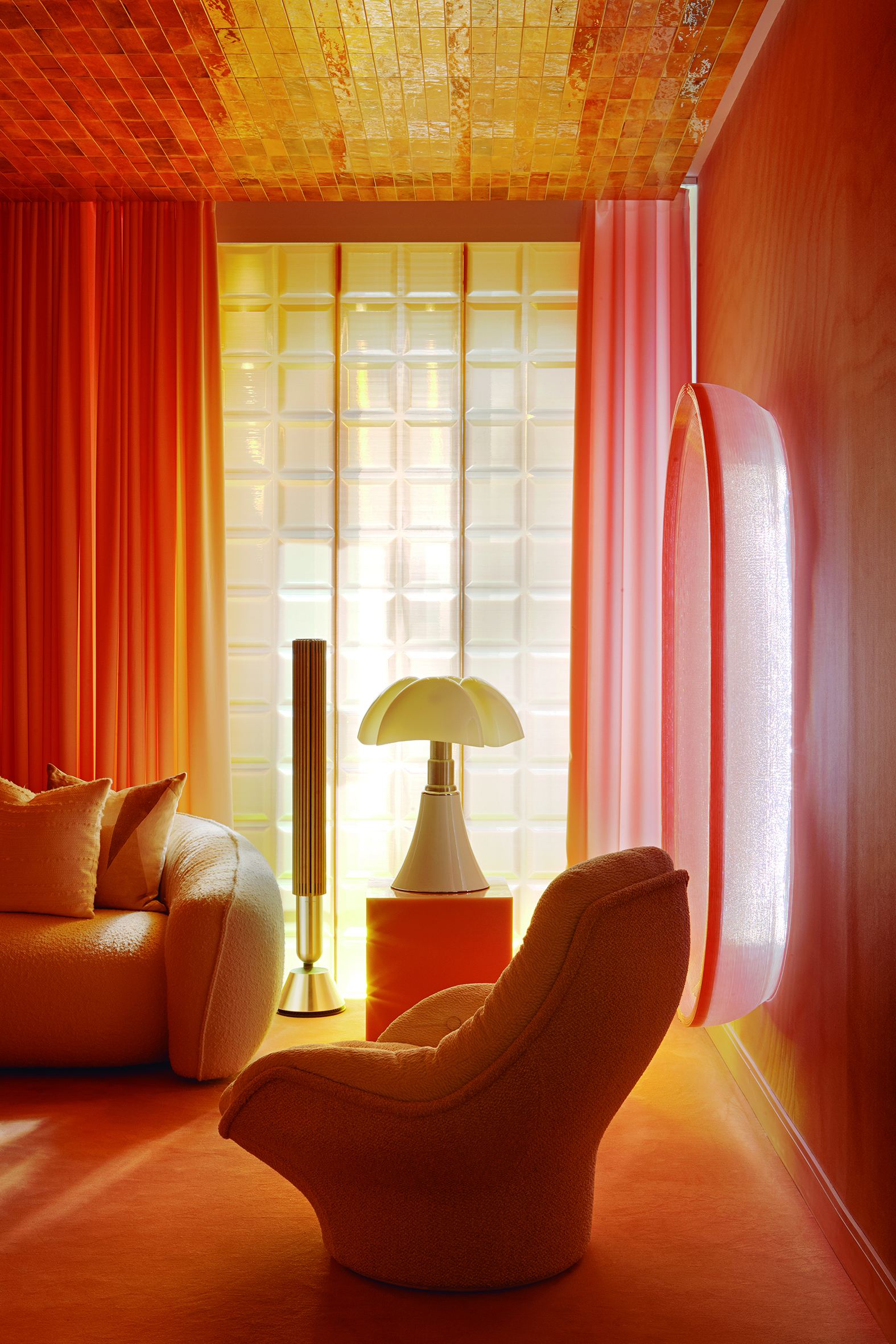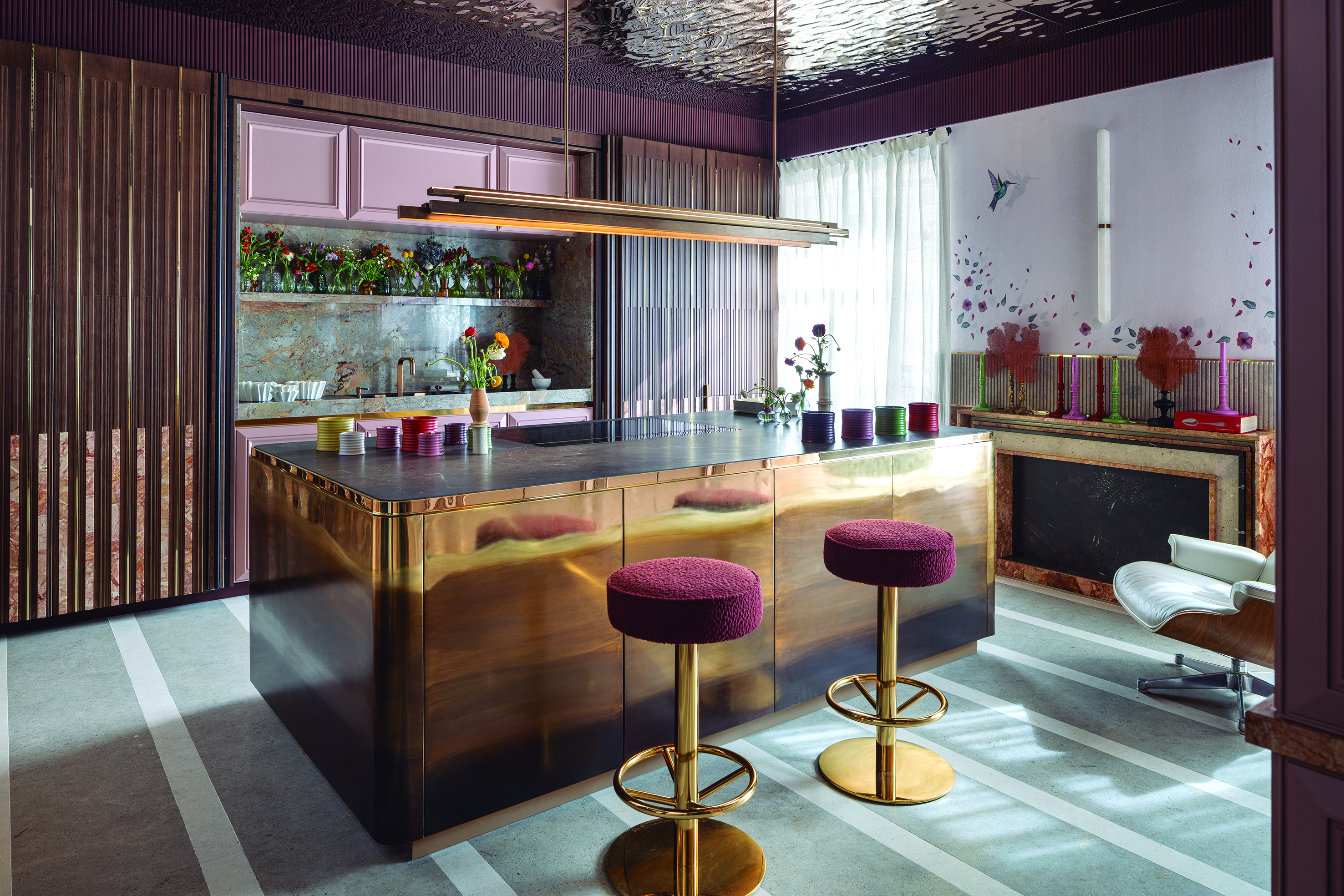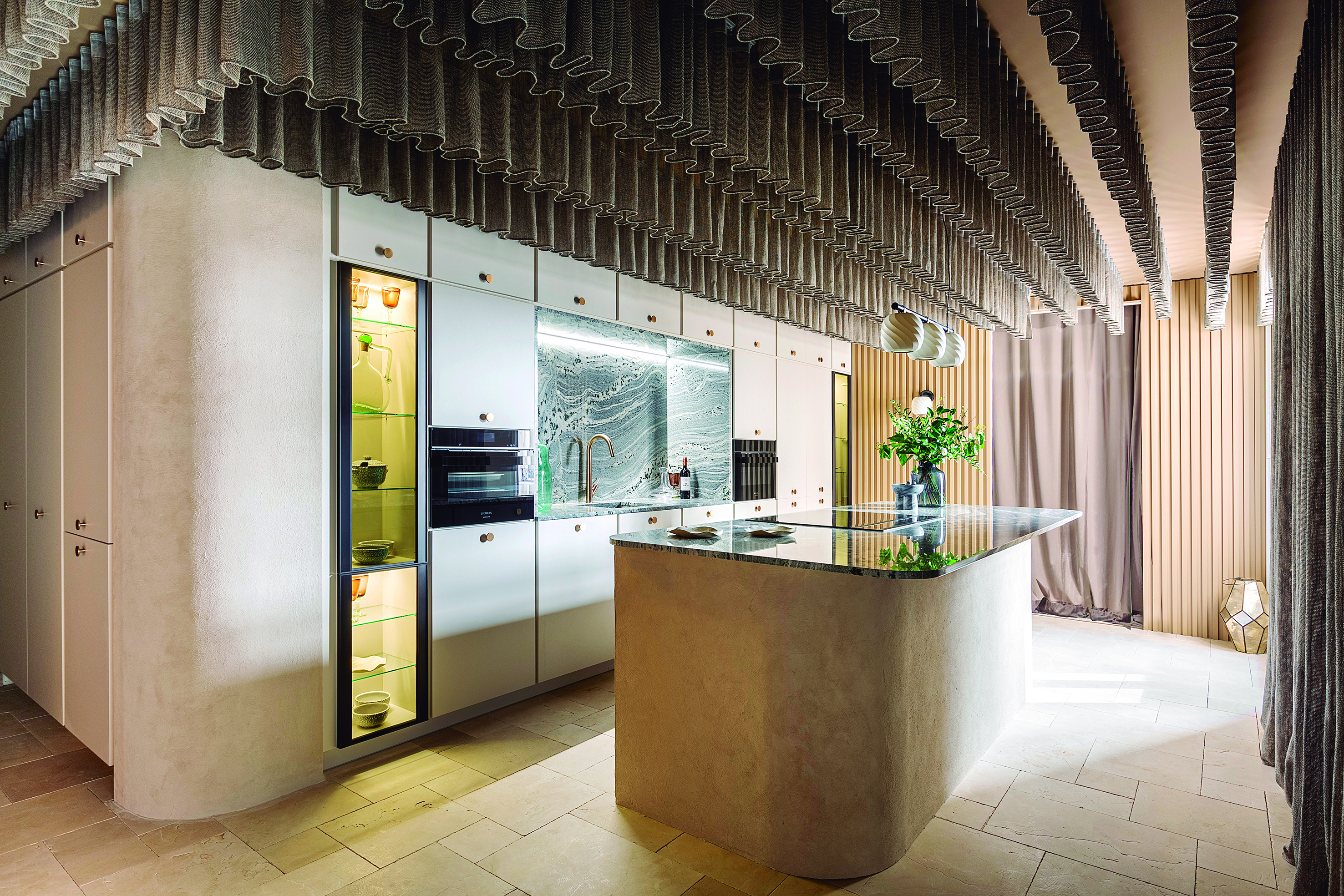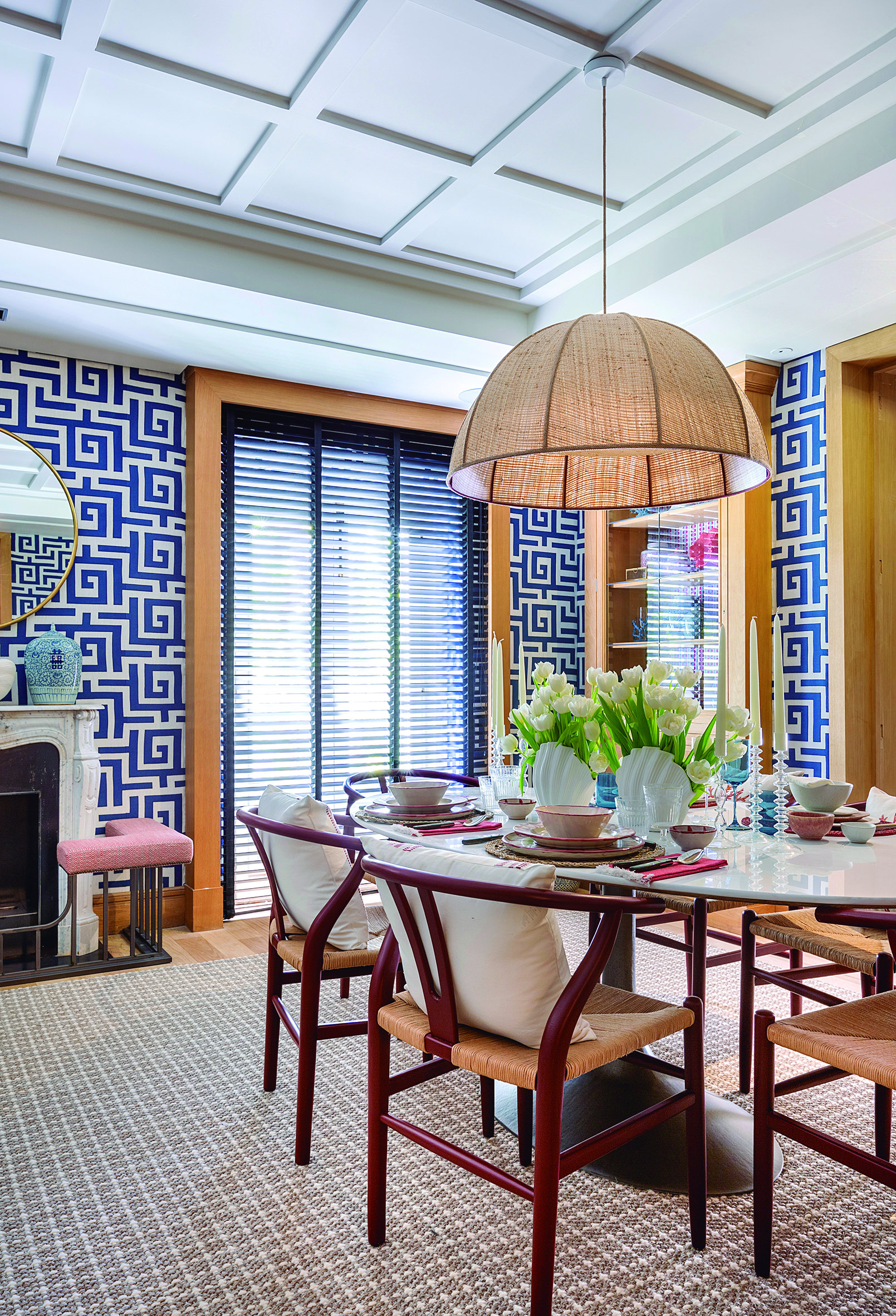 El auge del revestimiento mural: Paredes y techos son lienzos en blanco que se aprovechan al máximo para plasmar en ellos el concepto creativo del espacio. Se recubren de piedra, cerámica, paneles de madera lisa o palillería, escayolas y molduras, murales artísticos, papeles pintados y telas, arcilla, microcemento o pintura con texturas rugosas y volumen pronunciado.