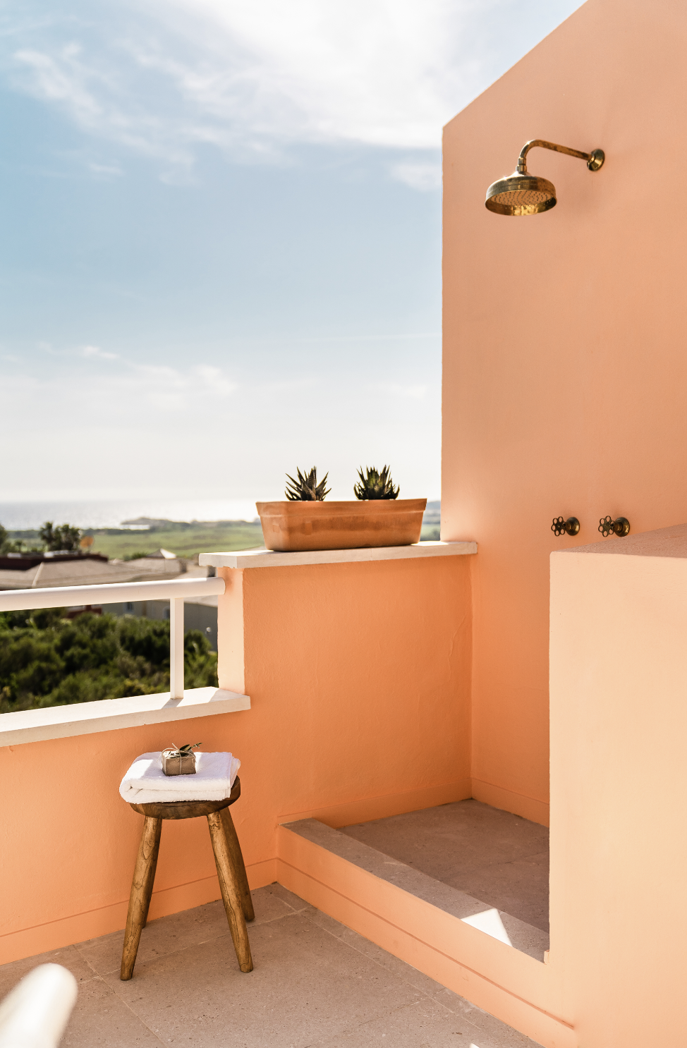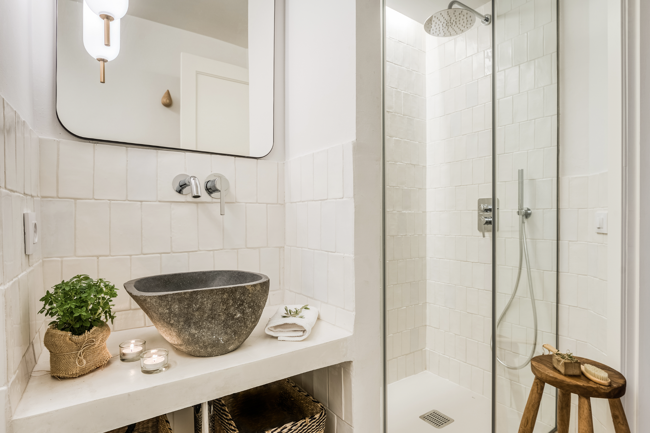 Los baños con pequeñas baldosas blancas tienen toques de maderas como los colgadores de toallas de Normann Copenhagen y los estantes bajo los lavabos de piedra natural. Las lámparas colgantes del baño en la suite son de cerámica hecha por encargo con diseño de Farré & Costa mientras que la lámpara del baño de invitados es de Aroma del Campo.
